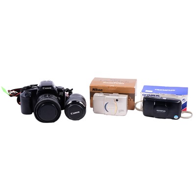 Canon EOS 1000f camera & spare lens, Nikon Lite Touch Zoom70WS camera, Olympus MJU Zoom camera. (Qty: 3)