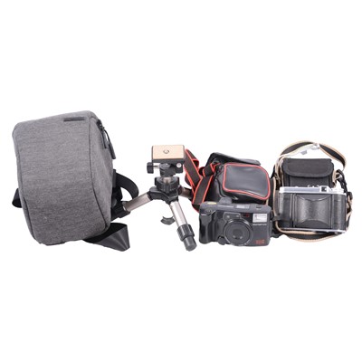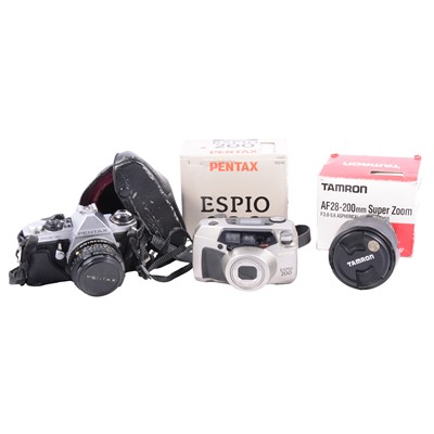 Pentax Super ME camera,, Pentax Espio 200 camera, Tamron lens and a Pentax mount.