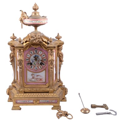 Louis XVI style 'Rose Pompadour' mantel clock, striking on a bell, porcelain mounted, 39cm.