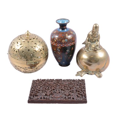 Cloisonne vase, brass figure and censer, carved hardwood plaque