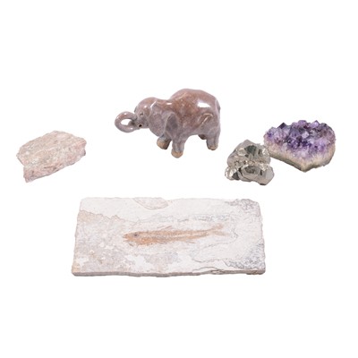 Small collection of natural history fossils, stones, crystals, etc including a Dapalis macrurus small fish fossil on thin rectangular cut slate with ... read more