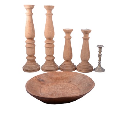 Two pairs of turned oak candlestands, 49cm, 32.5cm; a wooden shallow bowl, 37cm wide, and a metal candlestick. (Qty: 6)