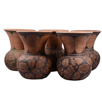 Set of four terracotta vases, late 20th century, flared necks, decorated with scrolling floral border beneath vacant panels, 27.5cm; and a similar (Qty: 5) ... read more