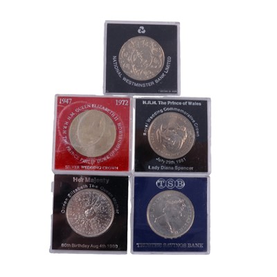 A small collection of £5 coins, commemorative coins and other coins, a Millennium £5 coin, Elizabeth II 1999; a Golden Wedding Anniversary £5 coin, (Qty: 1 box) ... read more