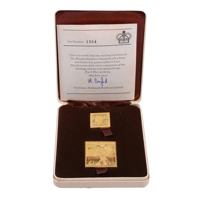 The Penny Black and £1 Machin, set of two 22ct gold replicas, Hallmark Replicas Ltd., issued 1973, 38grams, cased.
