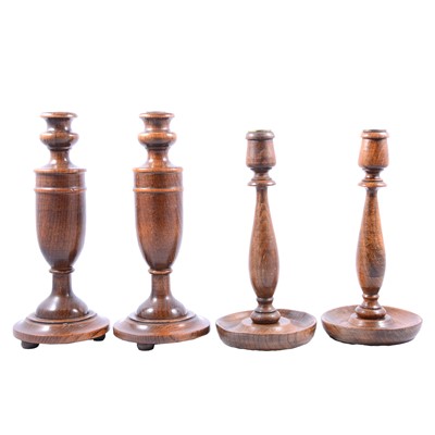 Two pairs of turned oak candlesticks, the larger pair, height 28.5cm, the slim pair, height 26cm. (Qty: 4)