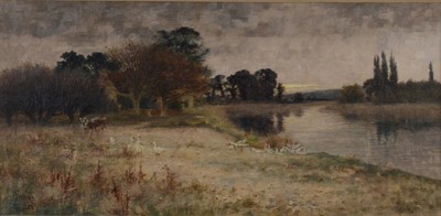 Sidney Pike, Geese and cattle by a riverbank, oil on canvas, signed and dated 1887, 30x60cm.