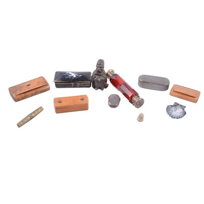 Victorian ruby glass double ended scent bottle, 14cm, enamelled rectangular box, wooden snuff boxes, silver vesta case, etc.