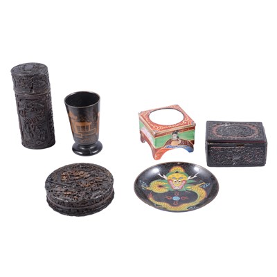 Chinese carved tortoiseshell box, circular form, diameter 9cm, a similar tall oval case, 12.5cm, damaged, carved lacquer box, paper mache cup, ... read more