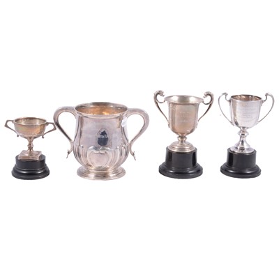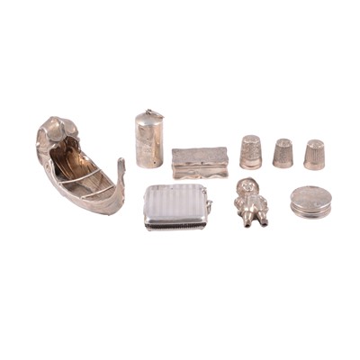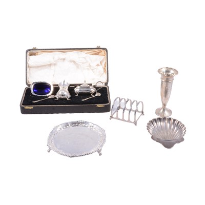 Small silver presentation card tray, Wiilliam Hutton & Son, London 1901, later engraved, three scrolled feet, three piece condiment set, cased, shell ... read more