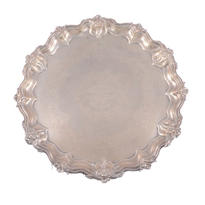 Silver salver, Walker and Hall, Sheffield 1891, engraved Pendle Forest and Craven Hunt... 1956, on three scrolled feet, diameter 32cm, 19ozt.