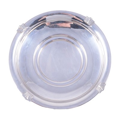 Silver bowl, hallmarks worn, circular shallow form the rim with four mounts, four feet, diameter 23cm, 9.5ozt.