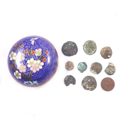 Nine Roman / Ancient coins, various sizes and designs; a halfpenny 1974; and a small, circular lidded cloisonne pot, dark blue ground, floral (Qty: 11) ... read more