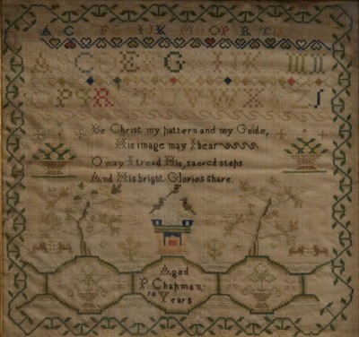 19th century needlework sampler, signed P Chapman, 10 years, with alphabet and verse above a pictoral band with birds, house, and trees, 31x32cm.