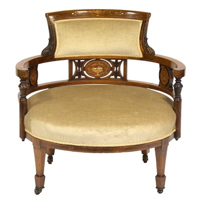 Victorian inlaid rosewood nursing chair, oval upholstered seat, square tapering supports, raised on castors, width 66cm, depth 52cm, height 63cm.