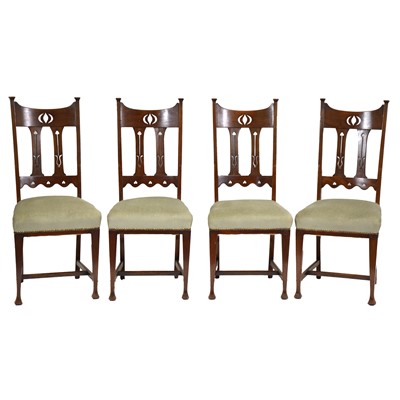 Set of four English Arts and Crafts walnut dining chairs, the broad rail back pierced with Art Nouveau style motif and stylised floral slats and (Qty: 4) ... read more