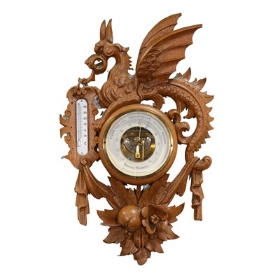 Dutch aneroid barometer, carved wooden frame with a dragon, the dial signed W J Lauwers, Amsterdam, 45cm.