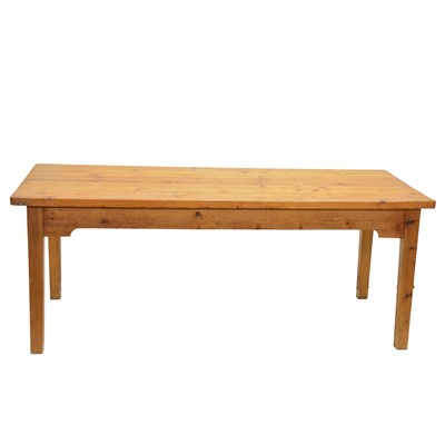 Pine kitchen table, rectangular top with rounded corners, square tapering legs, 197x85cm, height 76cm.
