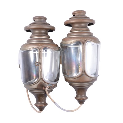 A pair of Bleriot brass carriage lamps, adapted for electricity, each with three bevelle glass panes, numbered '152', height 36cm.