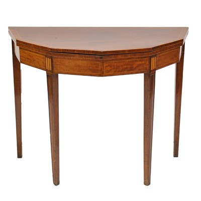 George III mahogany tea table, foldover top with six sides, broad crossbanding, deep frieze with outlines, width 94ccm, depth 46cm, height 74cm.