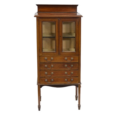 Edwardian mahogany music cabinet, two glazed doors over four flaps, inlaid outlines, square tapering legs, width 57cm, depth 37.5cm, height 130cm.