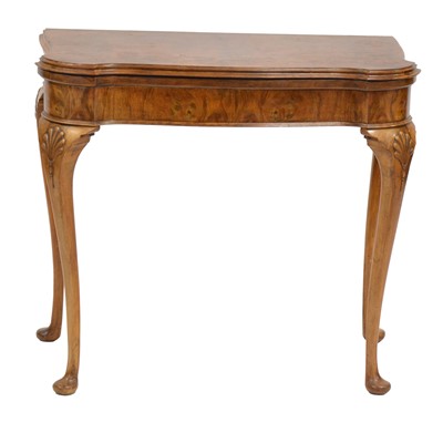 Reproduction figured walnut card table, serpentine foldover top, green baize lining, carved shell motifs to the knees, width 81cm, depth43cm, height ... read more