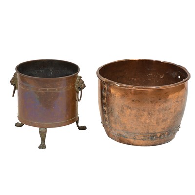 Old copper copper, with two later swing handles (currently detached) 48cm diameter, and another copper log bin, cast armorial crest, Lion mask (Qty: 2) ... read more