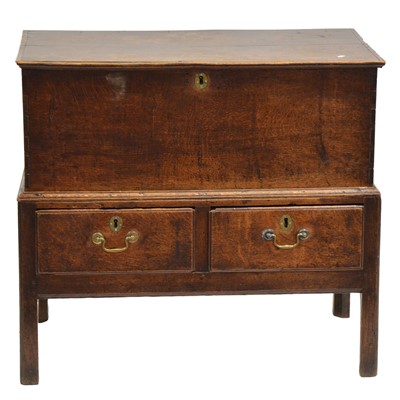 18th century boarded oak box, on later stand, the base with two drawers, square supports, width 85cm, depth 48cm, height 76.5cm.