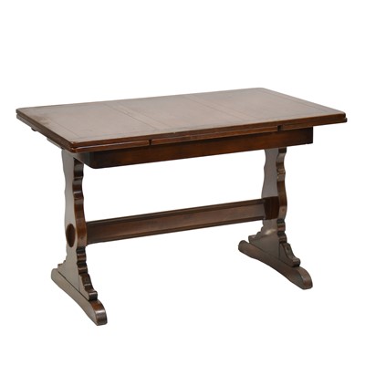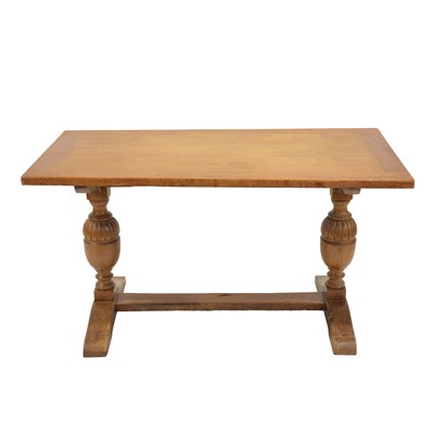 Oak dining table, rectangular fixed top raised on trestle base with turned and semi-fluted knopped supports, joined by H-stretcher, length 140cm, ... read more