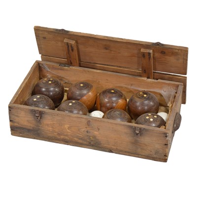 Set of eight vintage lawn bowls, in a pine case