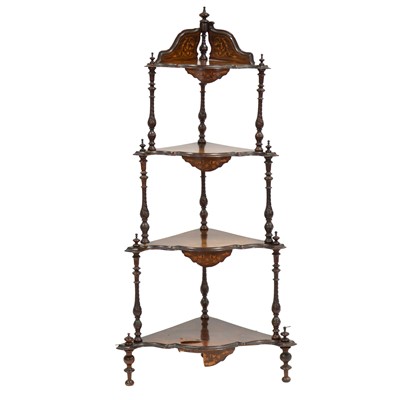 Victorian figured and inlaid walnut corner whatnot