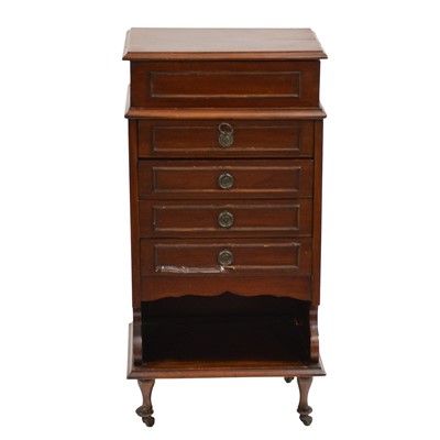 Edwardian mahogany music cabinet, with a hinged lid, and flat front drawers, short legs on casters, 48x38cm, height 94cm.