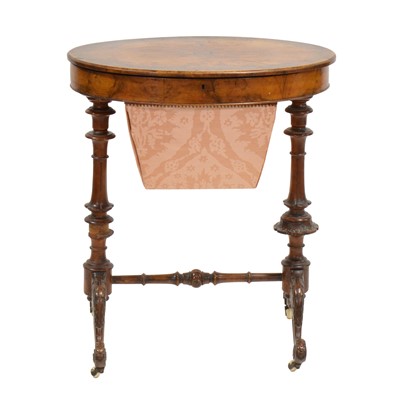 Victorian figured walnut worktable, oval, lid enclosing fretted compartments, stretcher base, 63x45cm, height 72cm.