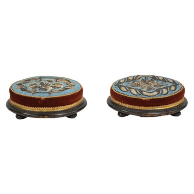 Pair of Victorian footstools, oval, beaded tops, ebonised bases on bun feet, 43x32cm. (Qty: 2)