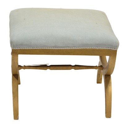 Stool, X frame with turned rail, light blue upholstered seat, 56x56cm, height 44cm.