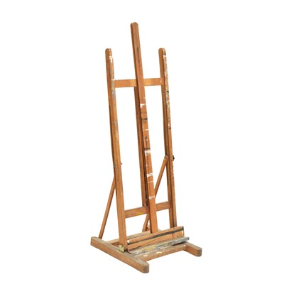 Beech artist's easel, floorstanding, defective, frame 133cm high, width 52cm; and a quantity of small gilt picture stands in the form of easels.