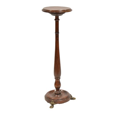 Mahogany jardiniere stand, circular turned top on a baluster column, turned base raised on three brass claw feet, diameter 33cm, height 107cm.