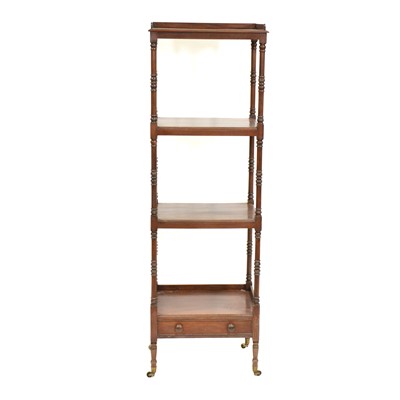 Regency style mahogany four-tier whatnot, the top tier with short three-quarter gallery, turned uprights, the lower tier fitted with a frieze drawer, ... read more