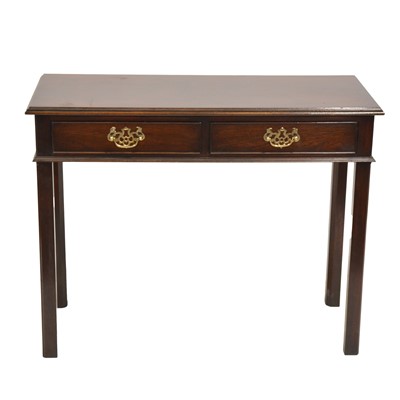 Mahogany reproduction side table fitted with two frieze drawers, square supports, width 91cm, depth 41cm, height 72cm.