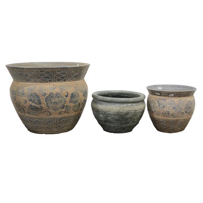 Three modern decorative jardinieres, including a large terracotta style with scrolling floral border in a grey-blue finish, 51cm diameter, 40cm high; (Qty: 3) ... read more