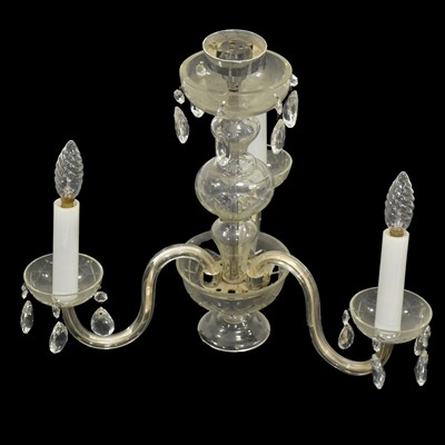 Glass three-light chandelier, cutglass column, three scrolled arms supporting cut glass sconces, with a bag of prismatic drops but possibly not ... read more