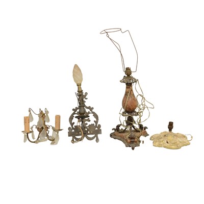 Assorted lighting parts and elements including a small pair of twin-light wall lights with cut glass drops, cast metal and cut glass ceiling pendant, ... read more