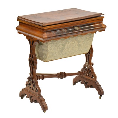 Victorian burr walnut games/work table, the hinged top concealing inlaid chess, chequers and cribbage board, above a compartmented drawer and work ... read more