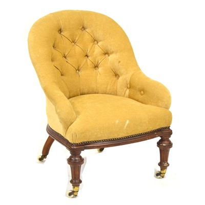 Victorian mahogany framed nursing chair, buttoned gold-dralon back, turned supports, raised on castors, width 60cm, height 73cm.