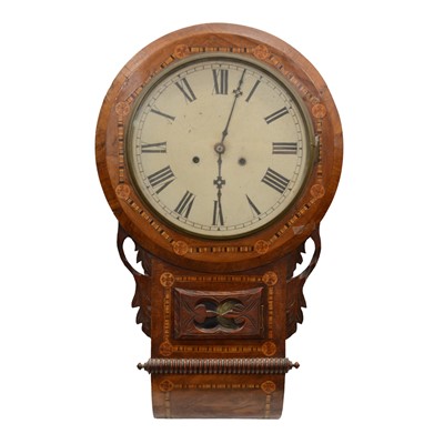 19th Century American wall clock, circular cream dial with Roman numerals, marquetry outlines, 68cm high, 42cm wide.