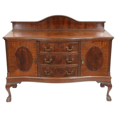 Edwardian mahogany dining room suite, comprising a serpentine sideboard, extending dining table, six chairs; together with four further Hepplewhite (Qty: 12) ... read more