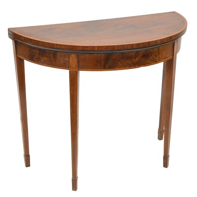 Mahogany fold-over card table, crossbanded outline, green baize interior, square tapering legs, width 92cm, depth 43.5cm, height 74cm.