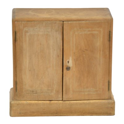 Small pine table top cupboard, with pair of doors with channelled outlines, enclosing two shelves, plinth base, width 52cm, depth 23cm, height 51cm.