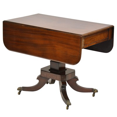 Regency mahogany pedestal Pembroke table, rectangular top with two drop leaves, tapering pedestal, splayed legs with brass paw feet and casters, ... read more