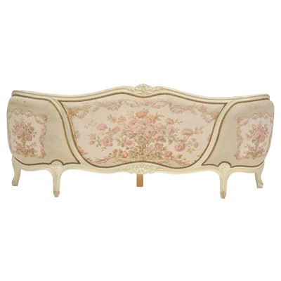 French double bed, carved and painted scrolling frame, floral tapestry upholstered, headboard width 161cm, height 121cm, with side rails and folding ... read more